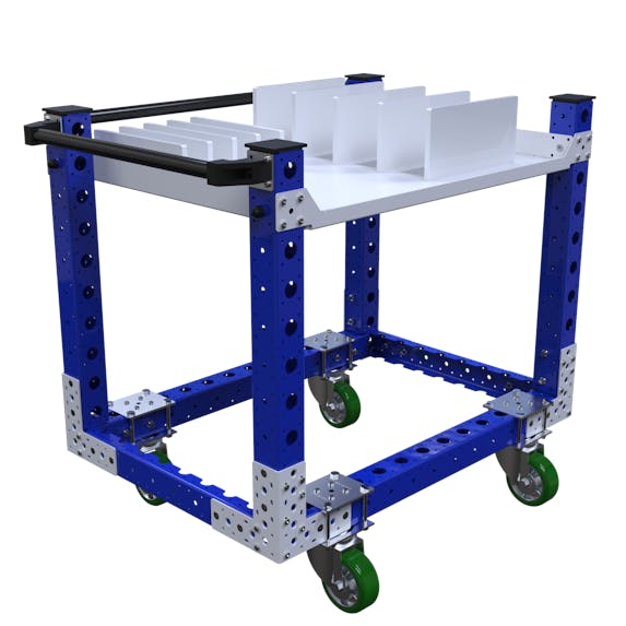 Flachregalwagen mit erhöhter Oberseite, individuell mit Trennwänden zum Transportieren loser Komponenten.