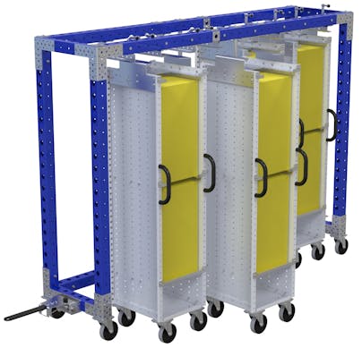 Mutter-Wagen zur Aufnahme von vier Tochter-Wägen. Perfekt für Kitting-Prozesse, bei denen Sie die Tochter-Wägen einzeln entfernen können, ohne die Anhängerkupplung zu lösen.