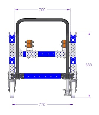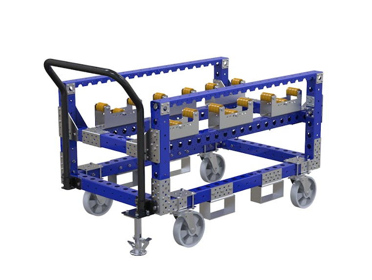 This cart is used to transport and prepare gearboxes or other large cylindrical objects for kitting. The rollers are made of polyurethane to not damage or scratch the parts. The cart is also equipped with four nylon swivel casters, a removable handlebar as well as a floor friction brake for smooth manual transportation.