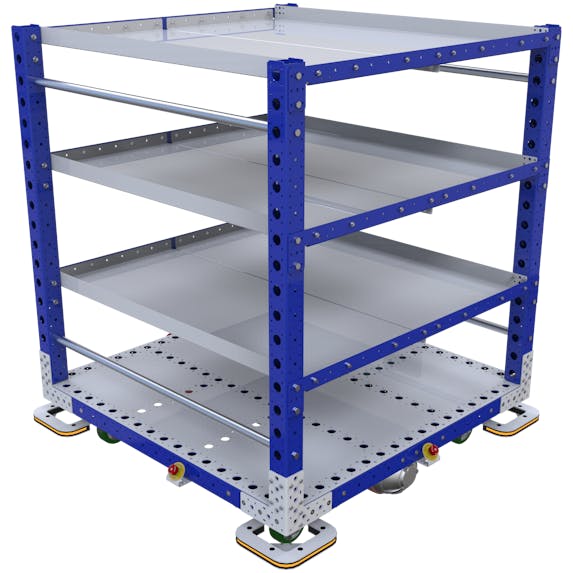 Motorisierter Flachregalwagen mit unserem AGV®-Konzept. Dieser Wagen hat eine dreistufige flache Regalstruktur.