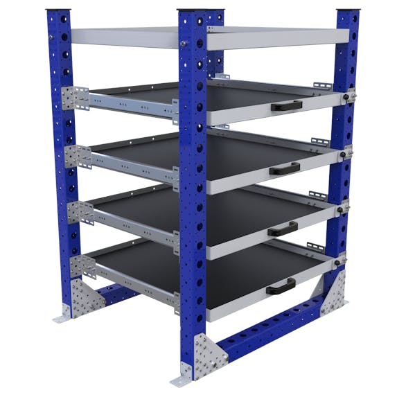 Dieses Rack wurde entwickelt, um mit dem Boden verschraubt zu werden. Das Regal kann zum Aufbewahren und Aufbewahren von Behältern, Behältern und Kisten verwendet werden. Jedes Regal ist mit einem Griff ausgestattet und kann zu 100 % aus dem Sockel herausgezogen werden. Die Regale werden mit der Regalverriegelungsplatte auf jeder Seite des Wagens verriegelt. Die Regalhöhe lässt sich einfach in 70 mm-Schritten verstellen. Die Lösung kann mit mehr/weniger Regalen angepasst werden.