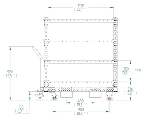 Flachregalwagen mit vier Ebenen, einer Lenkstange, Bodenbremse und vier hochwertigen Polyurethan-Laufrollen.