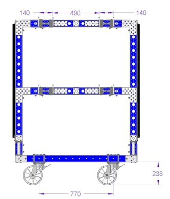 Hängewagen, der für den manuellen oder E-Frame-Transport ausgelegt ist. Der Wagen ist mit vier Aufhängern und Nylon-Lenkrollen ausgestattet.