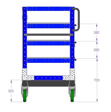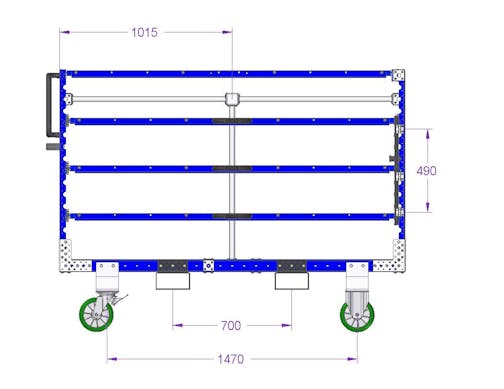 Ausziehbarer Regalwagen mit vier Ebenen zum manuellen Transport oder zum Transport mit FTF oder Gabelstapler.