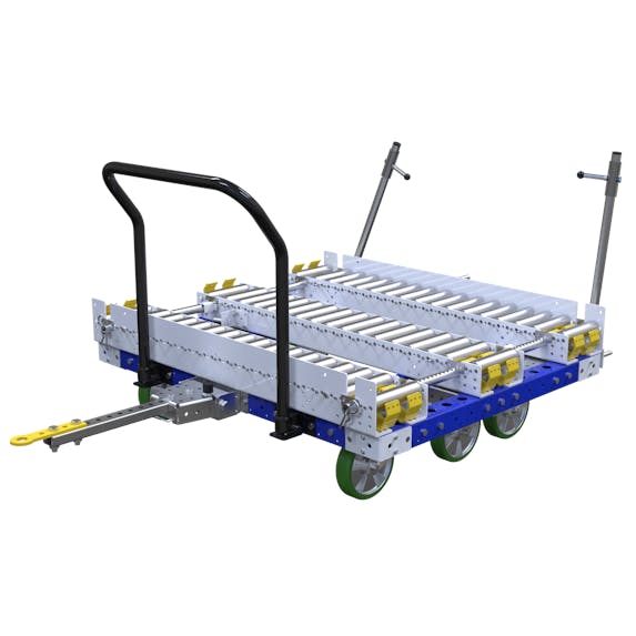 Ziehbarer Förderwagen, ausgestattet mit Handgriff, Anhängerkupplung und einer Arretierung für die hinteren Rollen.