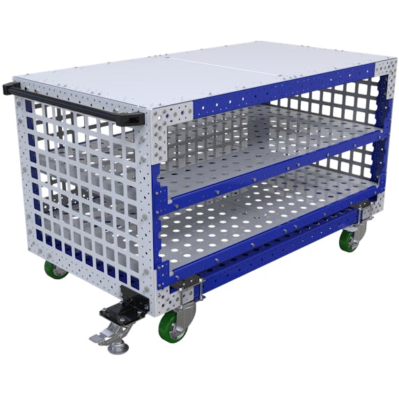 Schieben Sie den Wagen in drei Ebenen, zwei Regalen und einer obersten Ebene, um ihn als Tisch zu verwenden.