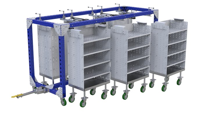 Ein Tochterregalwagen mit vier flachen Regalen, die so konzipiert sind, dass sie in einen Mutterrahmen passen.