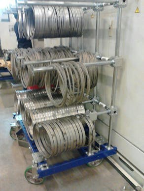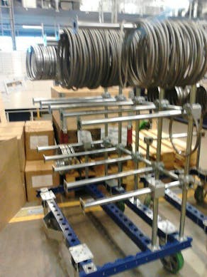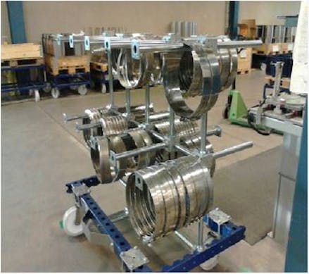 Kit-Wagen für ringförmige Metallteile. E-Frame-kompatibel und mit vier Polyurethan-Lenkrollen ausgestattet.